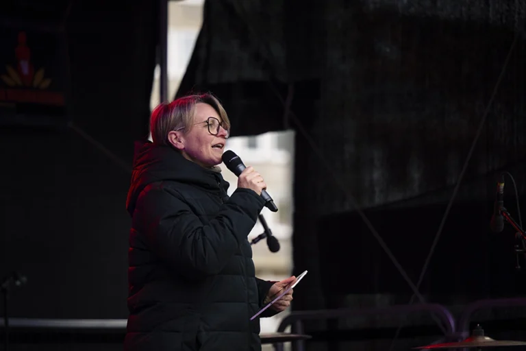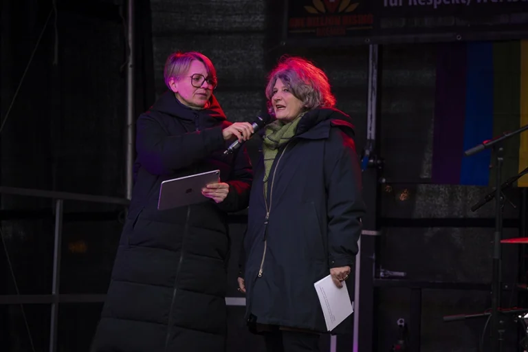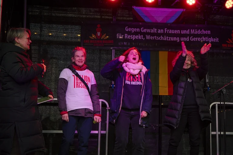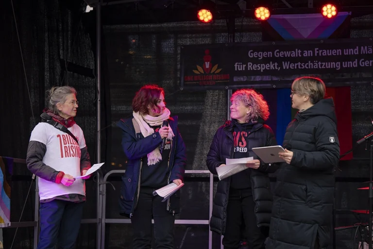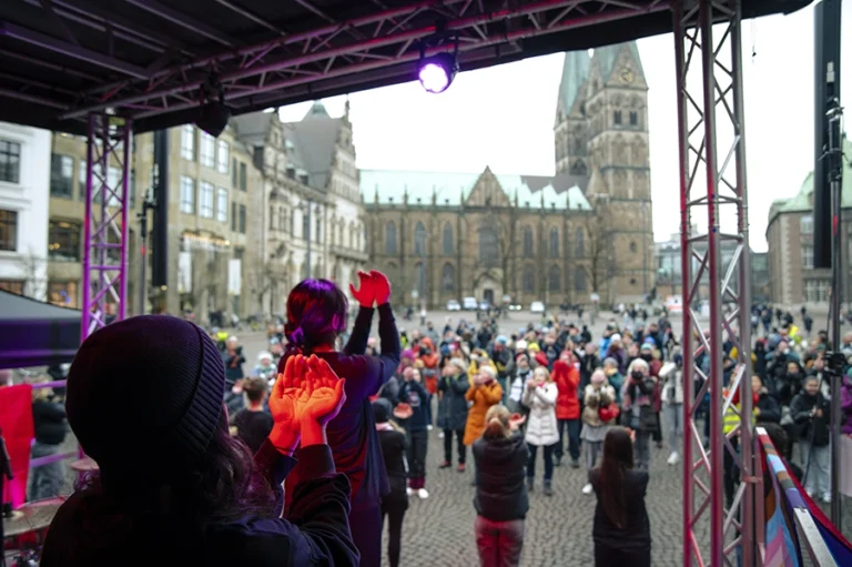 Im vergangenen Jahr musste One Billion Rising in Bremen ausfallen; in diesem Jahr ging es gleich zu Beginn der Neuausgabe richtig ab: das queer-feministische Elektro- und Synthpop Duo Paulinko heizte den rund 300 Teilnehmenden tüchtig ein. Mit ihrem Sound versprühten sie klare Botschaften im Geist des Female Empowerment und der Freiheit von Konventionen.